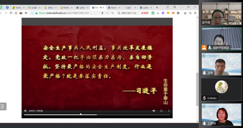 2023年5月26日,为深入学习习近平总书记关于安全生产的重要论述,教育引导师生员工树牢安全发展理念,学院组织开展了安全教育主题学习活动。全体教师共同观看了《生命重于泰山》专题视频,并对视频内容进行了认真学习交流,老师们表示受益匪浅,对于安全发展的认识和理解有了进一步提高,培养了消除安全隐患的自觉性。会上,王璟珉院长强调,大家一定要树立安全意识和防范意识,树牢“人民至上 生命至上”的安全发展理念,强化对于安全工作重要性的认识,在以后的教学与科研工作中尽量避免安全事故的发生。