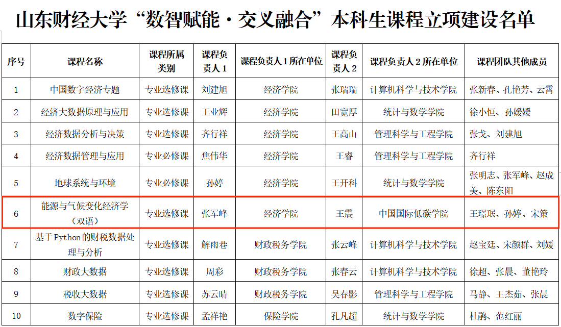 近日,山东财经大学组织开展的“数智赋能·交叉融合”本科生课程申报和评审工作结束。其中,经济学院与中国国际低碳学院联手打造,张军峰副教授、王震博士负责的能源与气候变化经济学(双语)课程通过申报和评审并进行立项建设。