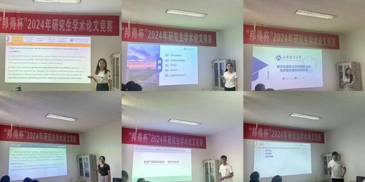 为培养学生科研创新能力,营造良好学术氛围,促进学生成长成才,6月11日上午,我院在燕山校区2807会议室举办“邦得杯”2024年研究生学术论文竞赛。山东财经大学副校长刘旻航,邦得科技控股集团有限公司董事长助理、邦得低碳学院负责人孙冬梅,集团品宣部经理孙小琼,工商管理学院党委书记赵世民出席活动。本次竞赛邀请到山东财经大学李国锋教授、王舒鸿教授、张明志副教授担任评委。