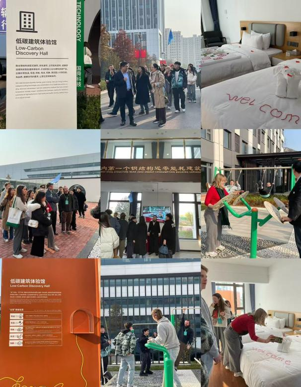 同学们首先来到低碳建筑体验馆,该体验馆是国内第一个钢结构近零能耗建筑体验馆,融合了钢结构装配式建筑、绿色建筑、近零能耗建筑、健康舒适建筑和智能建筑等技术。同学们参观了展厅,对园区的低碳建设理念有了更深刻的理解。其中最引人注目的是其“五恒”健康宜居理念,即恒温、恒湿、恒氧、恒洁、恒静。同学们还参观了舜庭五恒酒店,亲身体验了园区的低碳建筑。