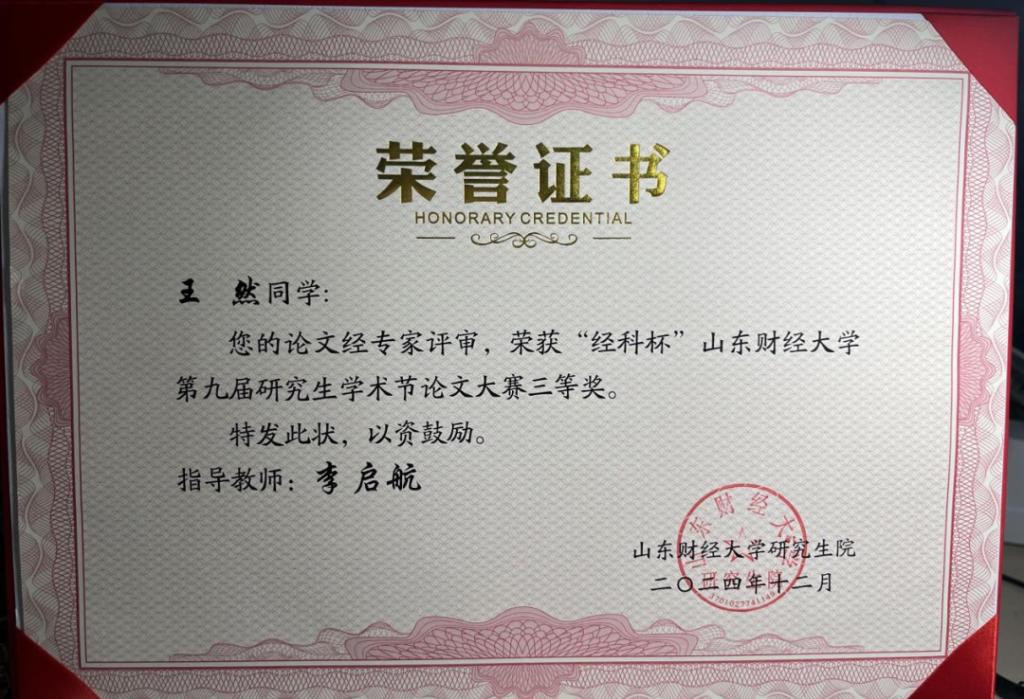 此次论坛为期三天,不仅为参会者提供了一个高质量的学术交流平台,还充分展示了山东财经大学在研究生教育领域的卓越成就。我院23级研究生王然作为代表参加了此次论坛,与众多学者深入交流。在经济分论坛上,王然以《要素驱动下创新导向的城市产业升级——基于资源型城市规划的准自然实验》为题进行了精彩的汇报。该论文剖析了资源型城市的设立如何推动城市产业结构高级化的内在机制,提出了富有洞察力的观点和建议,并最终荣获三等奖。