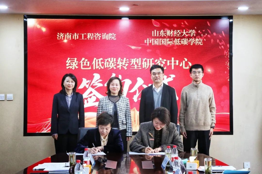 12月27日上午,由山东财经大学中国国际低碳学院与济南市工程咨询院联合发起的绿色低碳转型研究中心正式签约成立。我校党委委员、副校长彭红枫,济南产发集团党委委员、副总经理、总法律顾问郑莹莹,济南市工程咨询院党总支书记朱咏梅,中国国际低碳学院执行院长王璟珉等出席签约活动。