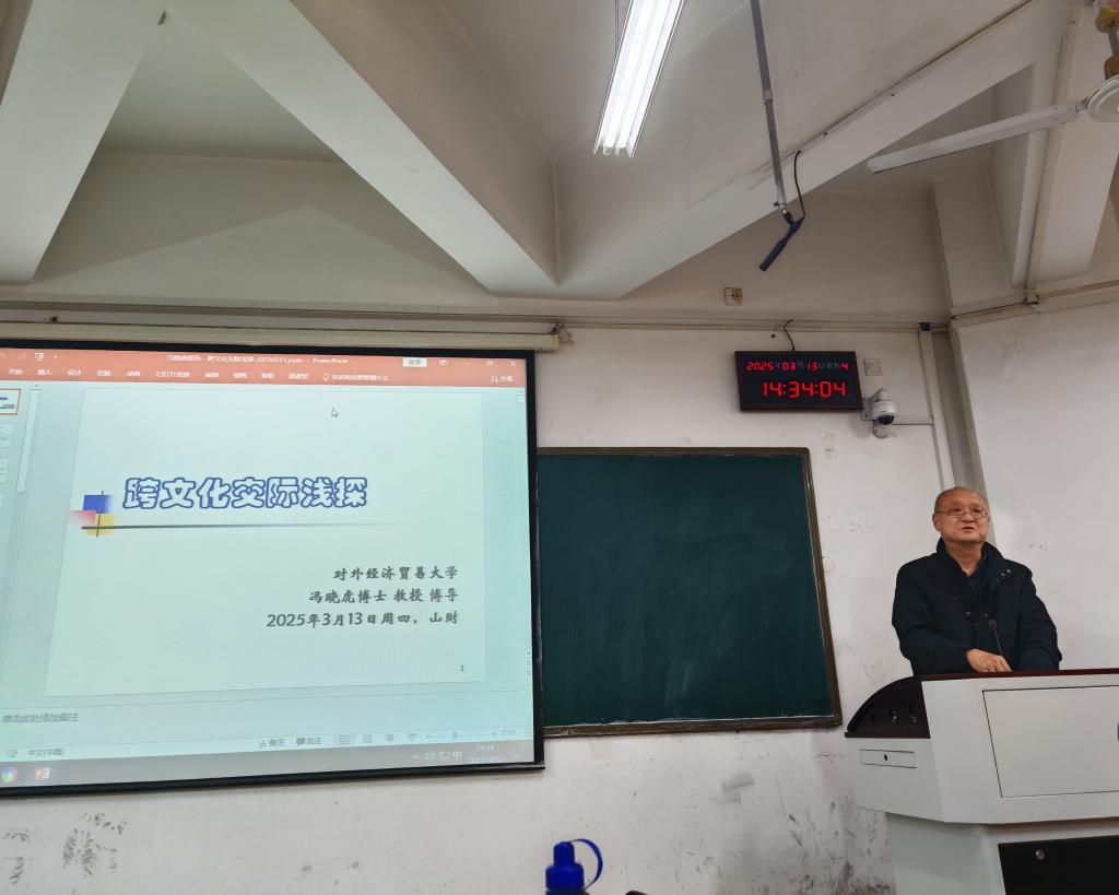 3月13日下午,由山东财经大学中国国际低碳学院、国际教育学院(留学生工作办公室)联合主办的跨文化交际浅探专题讲座在舜耕校区6号教学楼举办。本次讲座邀请到了对外经济贸易大学教授冯晓虎博士作为主讲嘉宾。我院师生与国际教育学院(留学生工作办公室)学生参加参加。