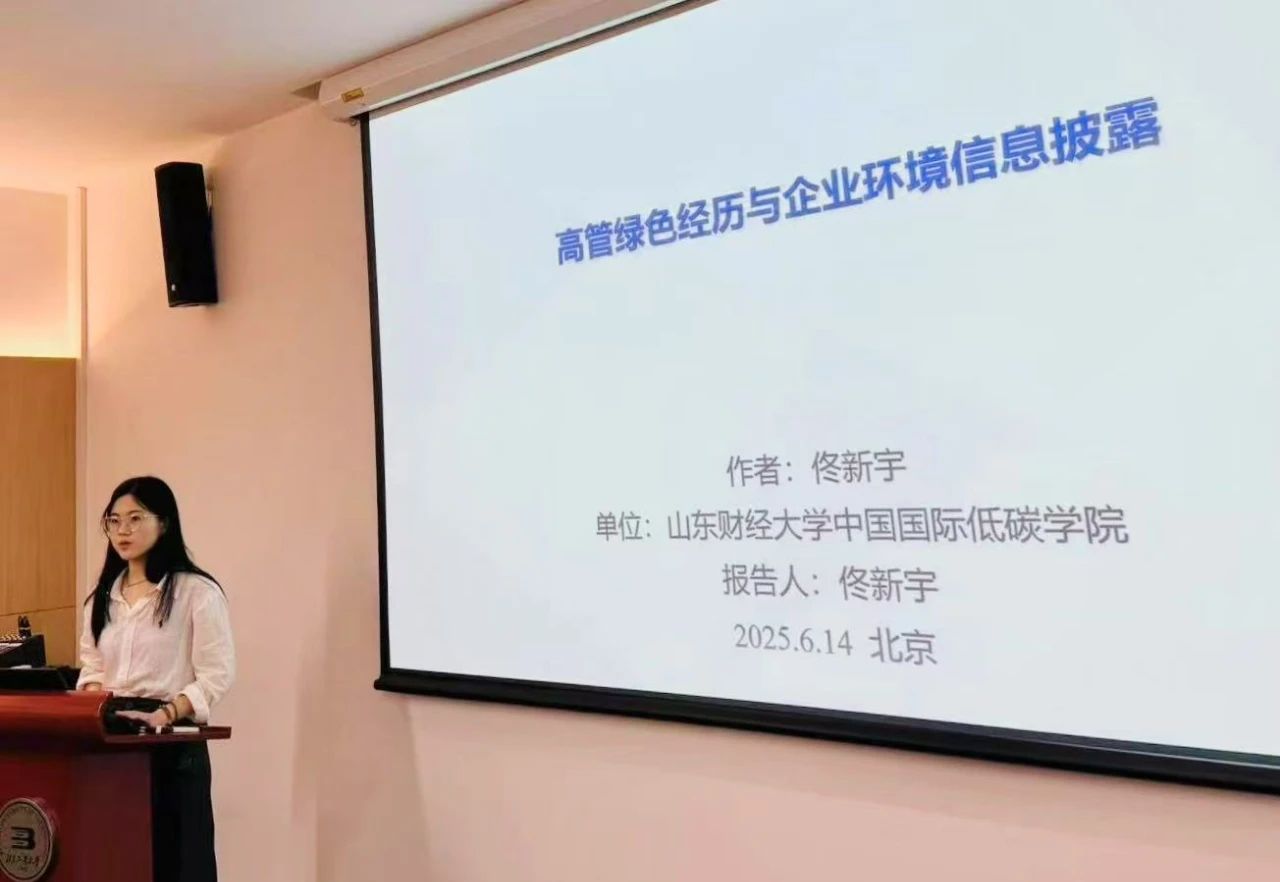 在学生学术沙龙分会场上,来自5所高校的碳中和相关专业研究生带来了精彩的学术报告。聚焦前沿课题,从能源高效转化技术、产业绿色低碳化升级、新型能源技术探索等方向,分享各自的研究成果与创新思路。来自我院的研究生佟新宇作为首位分享者,做了题为《高管绿色经历与企业环境信息披露》的学术论文交流。现场学术氛围浓厚、互动积极,围绕技术难点、研究方法等展开充分讨论,展现了各位青年学子在碳中和领域的钻研精神与创新活力。