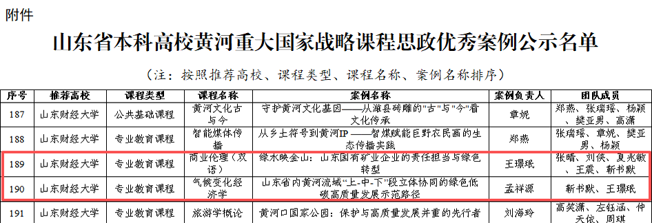 2025年度山东省本科高校黄河重大国家战略课程思政优秀案例名单近日揭晓,山东财经大学一举斩获5项,其中2项由我院教师王璟珉、孟祥源等牵头完成。