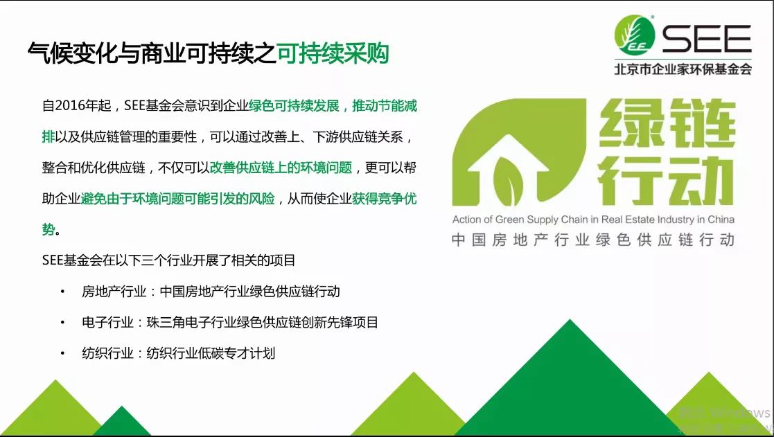 接着,郑老师重点向大家介绍了气候变化与商业可持续的核心项目:气候变化与商业可持续之可持续采购。郑老师谈到目前SEE正在积极推动中国房地产绿色供应链行动,该行动由来自政府部门、行业协会、龙头企业、相关NGO以及第三方技术机构的10家代表组成,现有100家房地产企业已经参与绿链行动。郑老师还向大家展示了绿链行动的行动机制及采购品类,并提到绿链行动正在努力促进行业绿色“净化”及变革,且已经形成了两份行业研究报告。