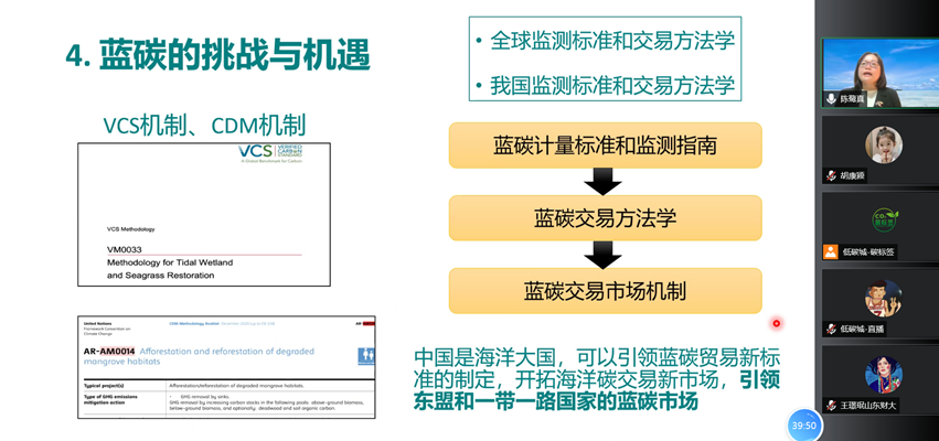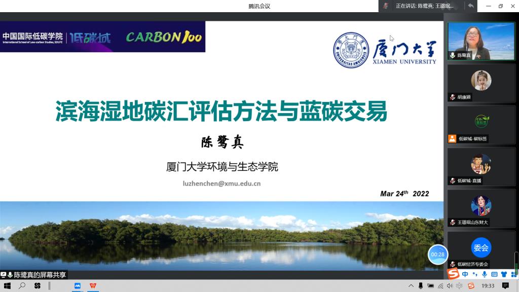 此次讲座,厦门大学环境与生态学院陈鹭真教授做了题为《滨海湿地碳汇评估方法与蓝碳交易》的汇报,主要内容分为四部分:滨海蓝碳硏究基础,滨海蓝碳评估方法体系,滨海蓝碳交易方法学,蓝碳的机遇与挑战。