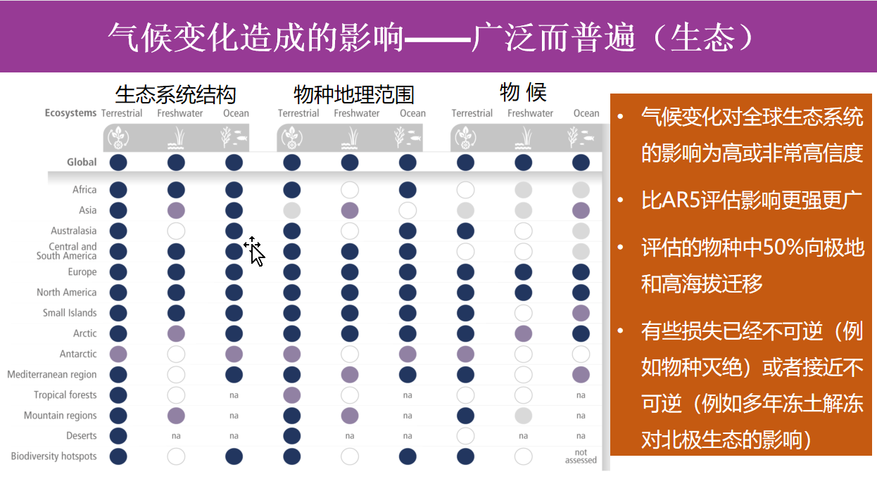 全球气候变化已经产生了深刻而广泛的影响,用公式来表达,即:“气候变化影响或风险=极端事件/气候变化×脆弱性×暴露度”。IPCC第二工作组第六次评估报告指出:人类引起的气候变化,包括更加频繁和剧烈的极端事件,已经对自然和人类造成广泛的不利影响和相关损失及损害,超出了自然气候变率。天气和气候极端事件的增加导致了一些不可逆转的影响,因为自然和人类系统被推至超出其适应能力,但是一些发展和适应努力降低了脆弱性。